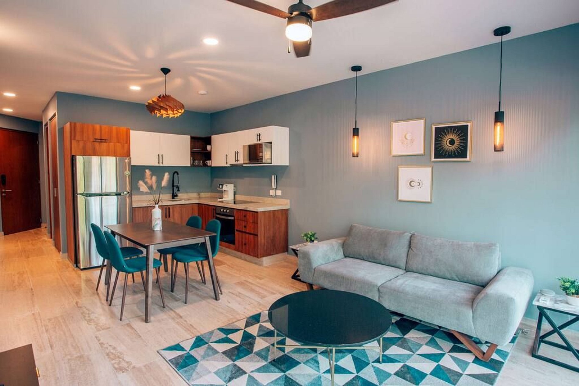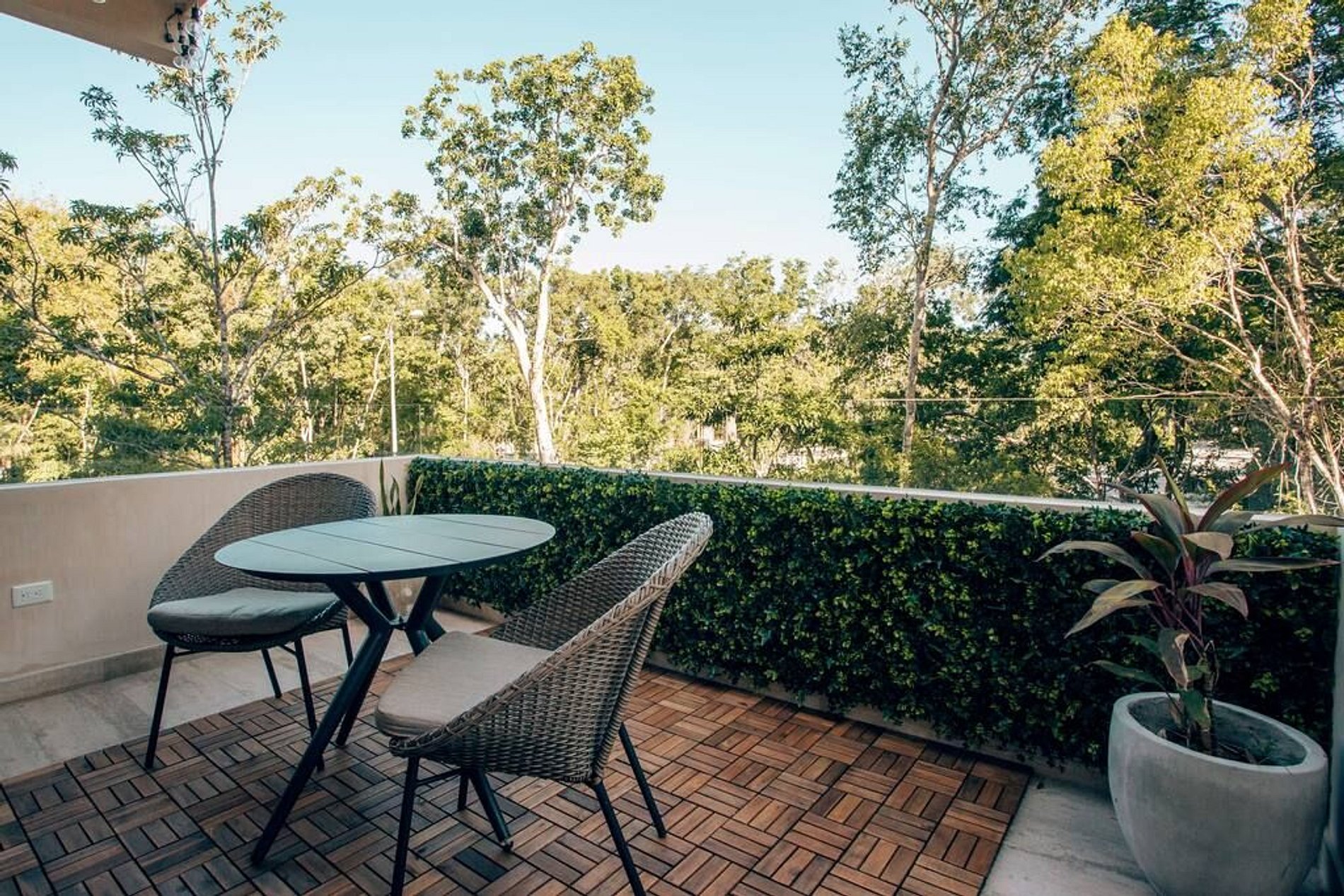 The apartment features one bedroom with a King Size bed, a fully equipped kitchen, and a living room with a sofa bed perfect for extra guests. Enjoy the jungle view and peaceful atmosphere from your private balcony — a comfortable, natural space to experience Tulum.