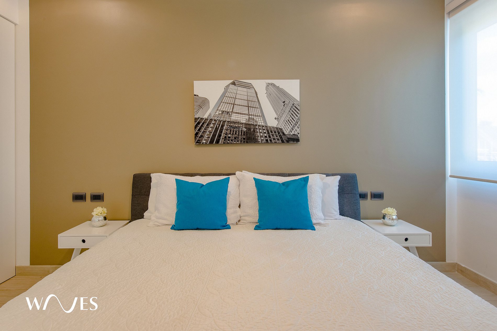 El departamento cuenta con una recámara con cama king, dos baños completos, sala con sofá cama, cocina totalmente equipada y balcón con vista a la calle. Espacioso, luminoso y diseñado para el confort, incluye Smart TVs, WiFi rápido y acceso a la piscina del rooftop. También dispone de estacionamiento subterráneo y gimnasio.