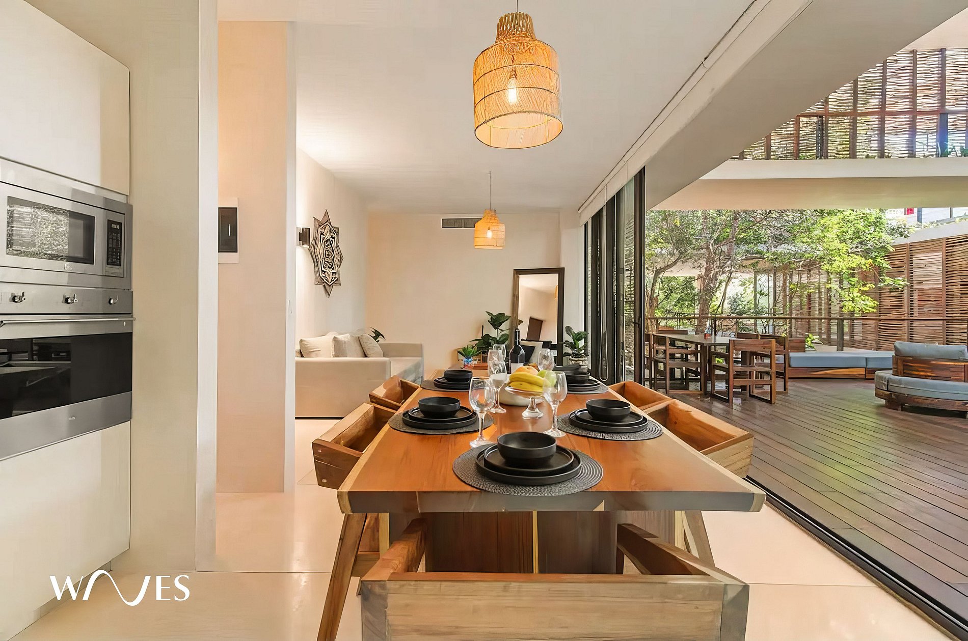 Este encantador departamento cuenta con 2 recámaras, cada una equipada con baño completo, cama King size y TV. Relájate en el amplio sofá-cama de la sala. La cocina, con acabados de lujo, se integra con el comedor, que se abre a una terraza privada con sala exterior y una alberca privada, donde podrás disfrutar de una fabulosa conexión con la naturaleza.