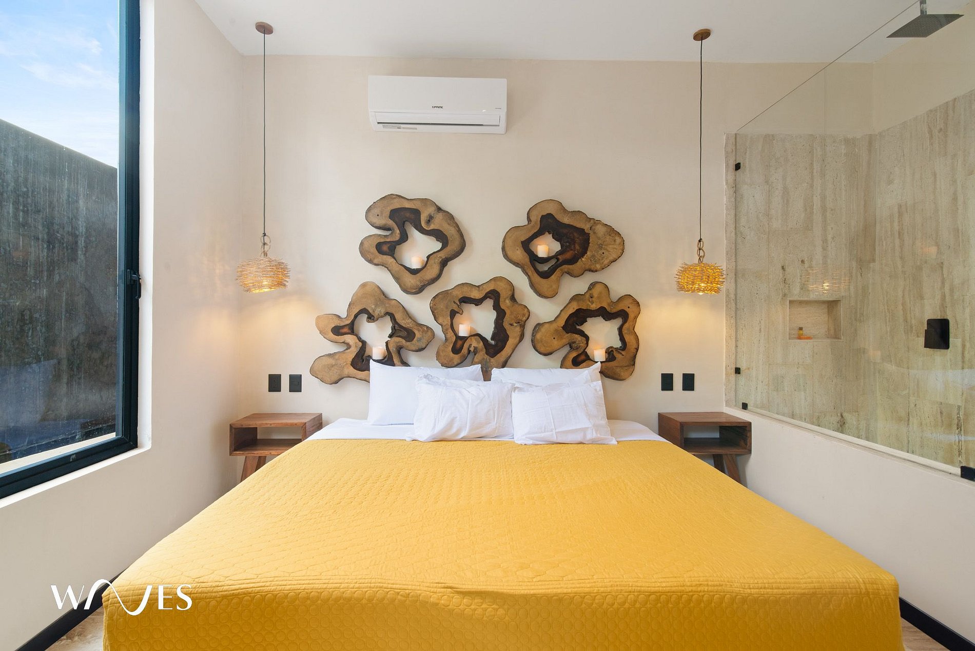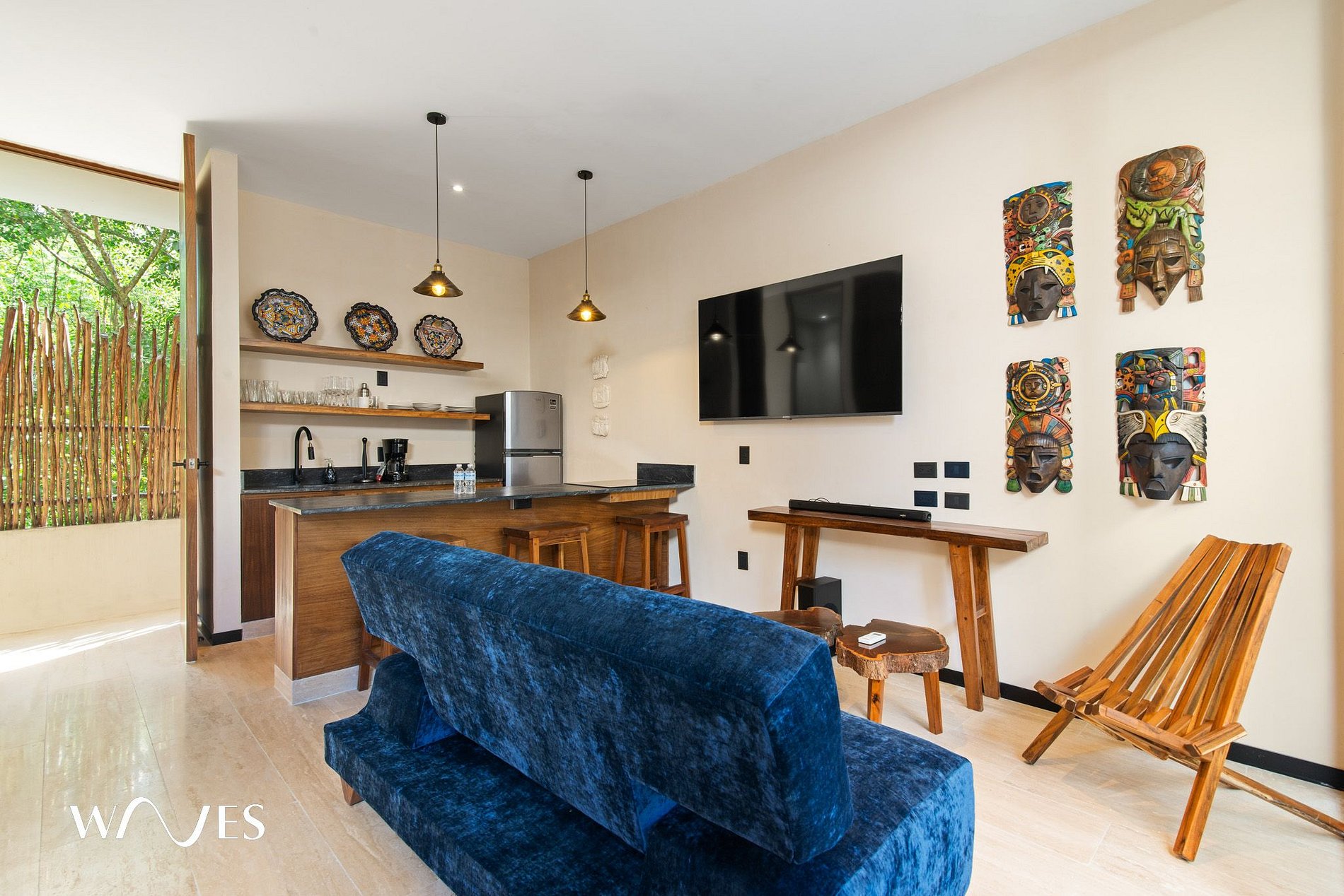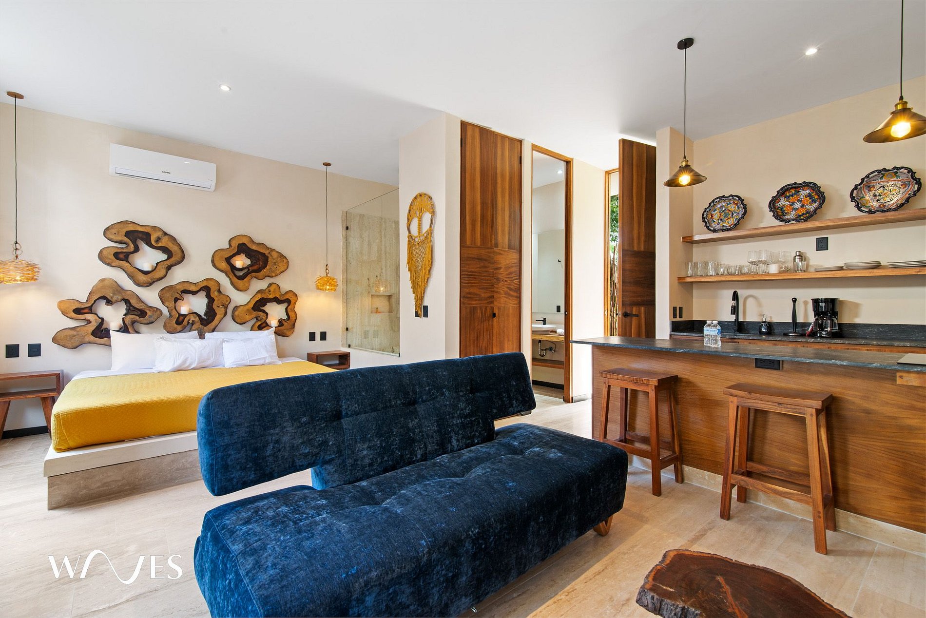 Este acogedor estudio cuenta con una cómoda cama king size y un sofá cama, Smart TV, aire acondicionado y baño privado. La cocina está totalmente equipada e incluye barra desayunadora y todos los utensilios necesarios para tu comodidad. Ideal para parejas, amigos o familias, con internet de alta velocidad y una ubicación privilegiada para disfrutar lo mejor de Tulum.