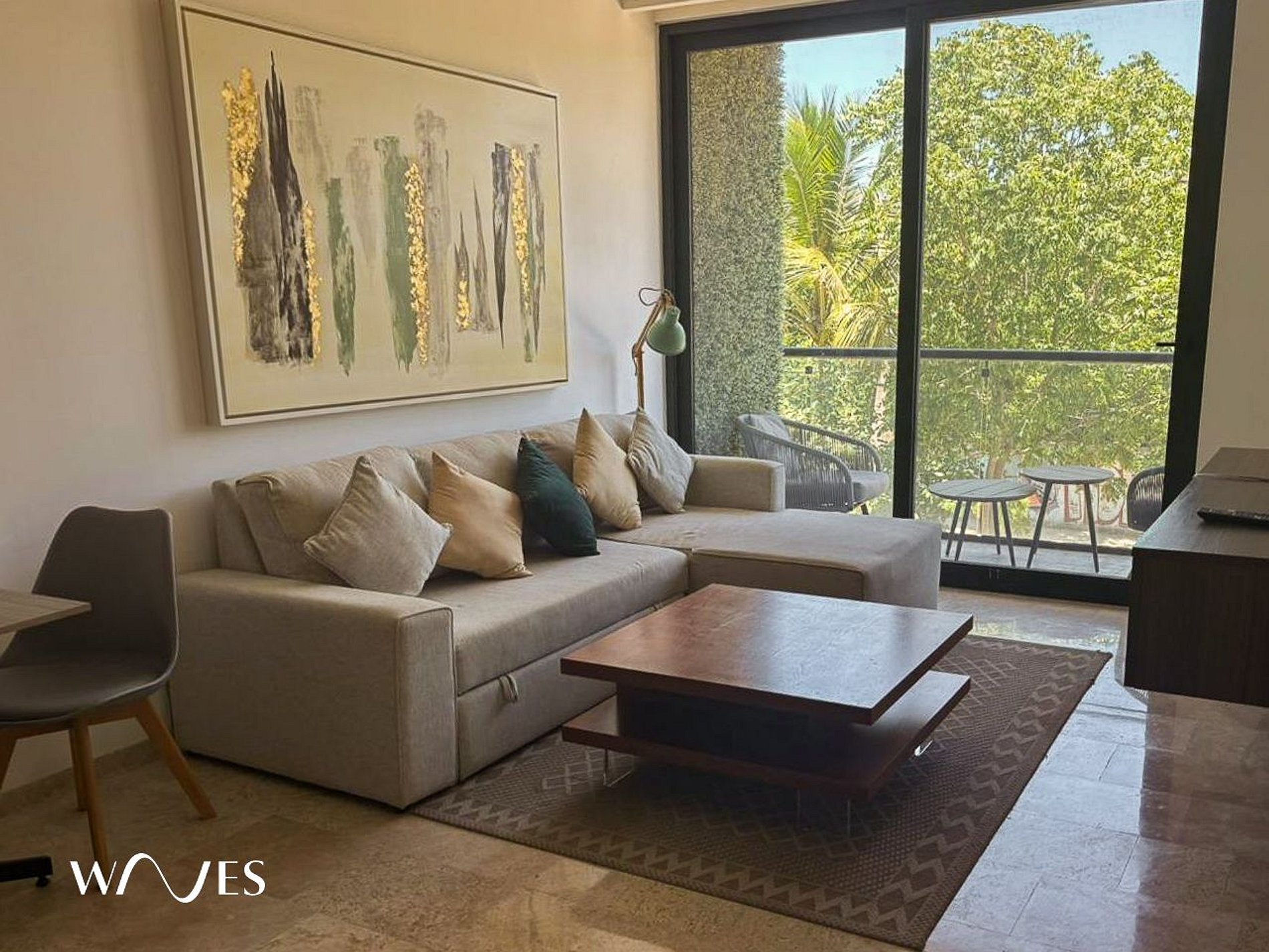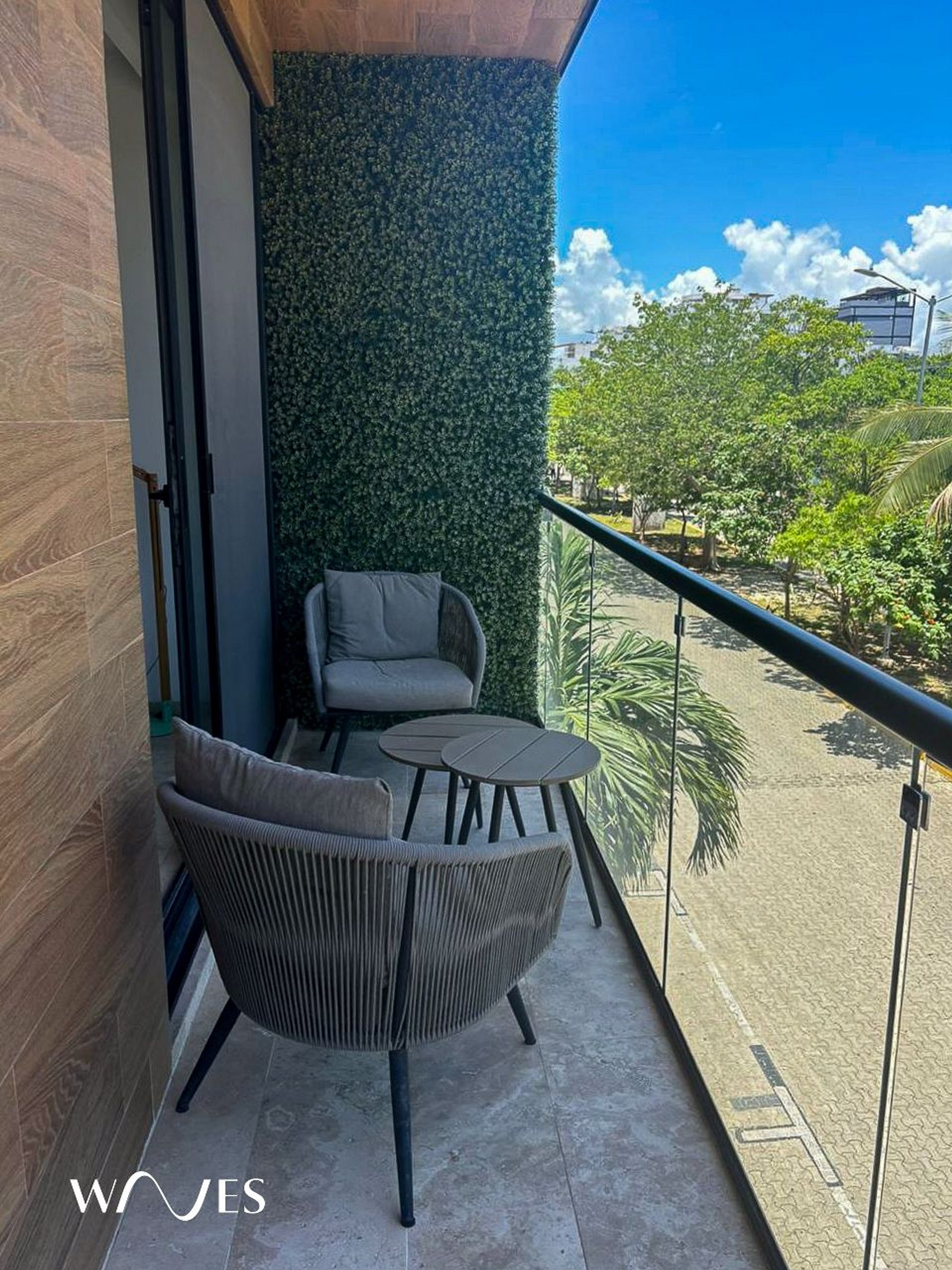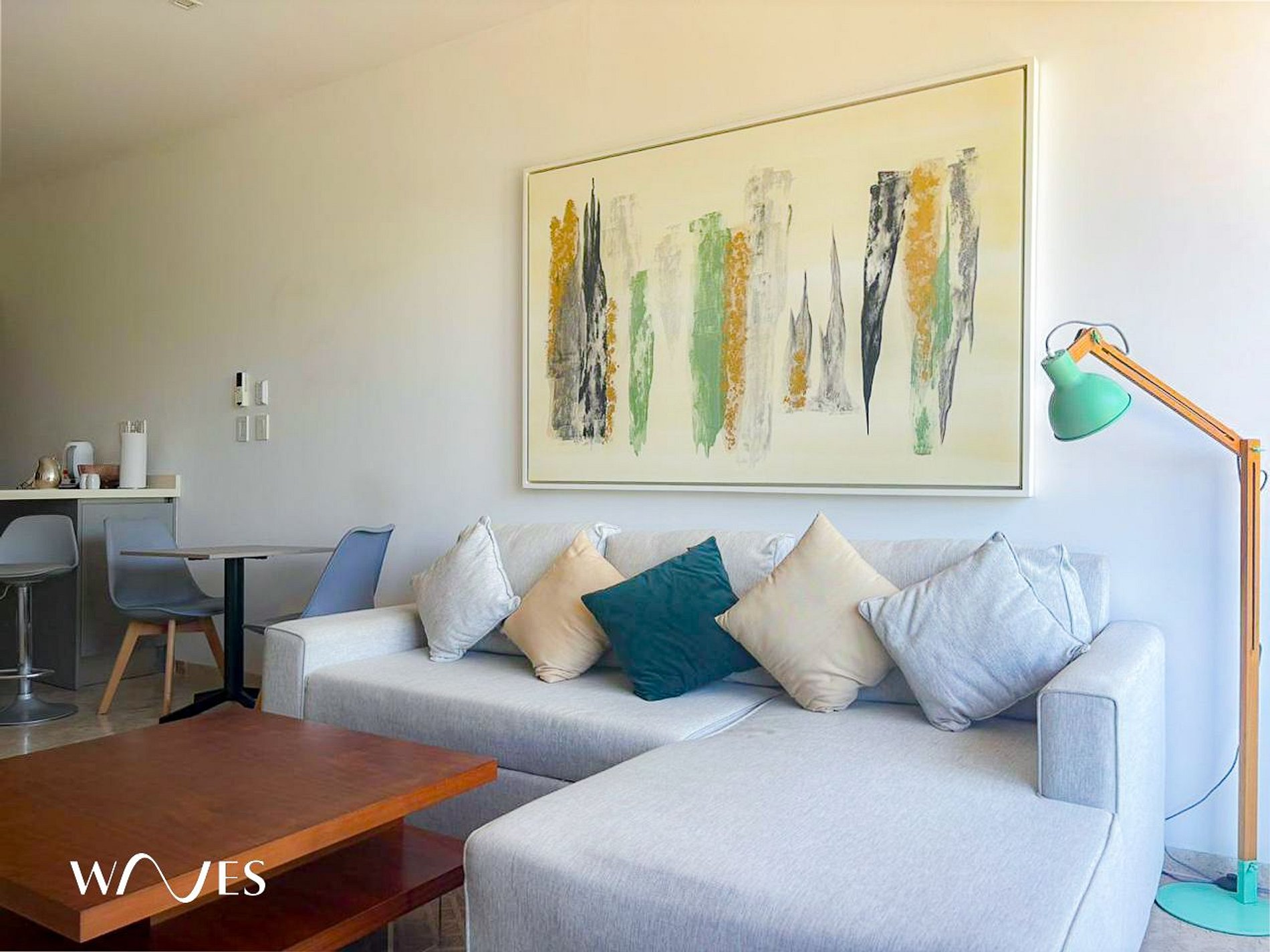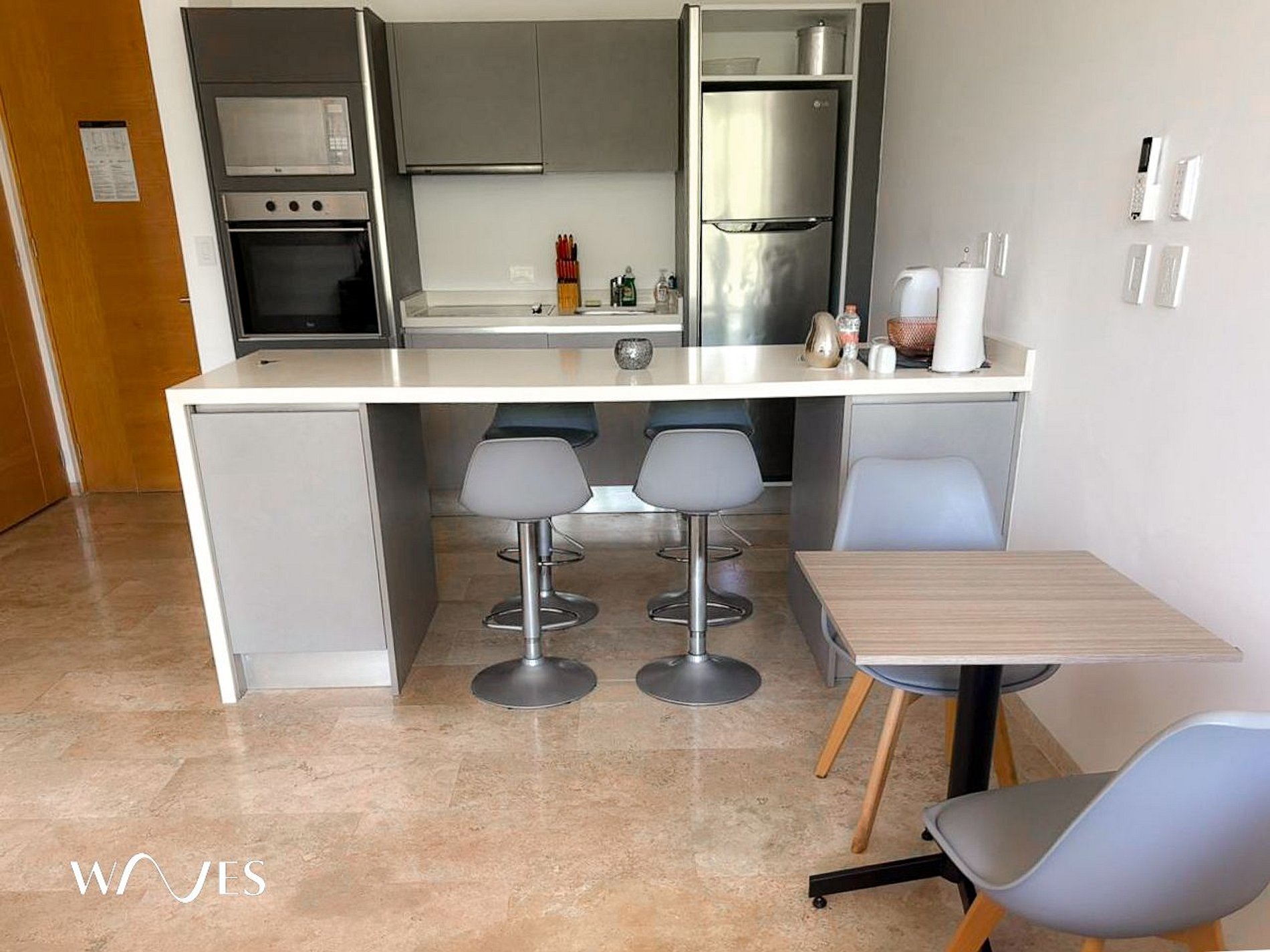 El departamento cuenta con una recámara, un baño completo, sala con Smart TV y sistema de audio SONOS, y cocina totalmente equipada. La terraza ofrece vista parcial al mar y espacio para relajarse. Luminoso y moderno, el departamento es ideal para parejas, amigos o viajeros que buscan comodidad y estilo a pocos pasos de la playa.